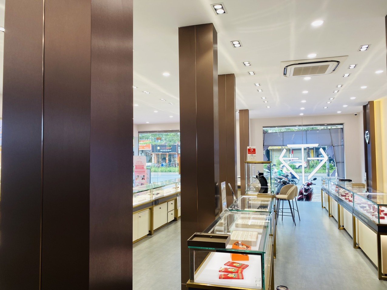 Một không gian cửa hàng sang trọng được tô điểm bởi tấm ốp tường đa năng sợi than tre vân kim loại xước đồng, giúp khách hàng có thêm trải nghiệm mua sắm trang sức...